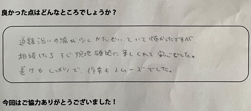 道路沿いの塀が少し傾いていて怖かったのですが、相談したらすぐ現地確認に来てくれて安心でした。養生もしっかりで、作業もスムーズでした。