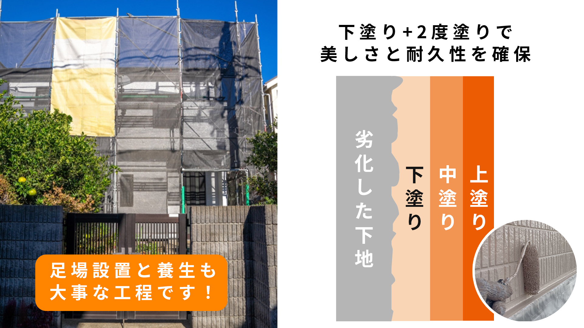着工前に近隣へのご挨拶を行い、足場や養生でしっかり対策します。騒音・においの配慮も徹底しています。